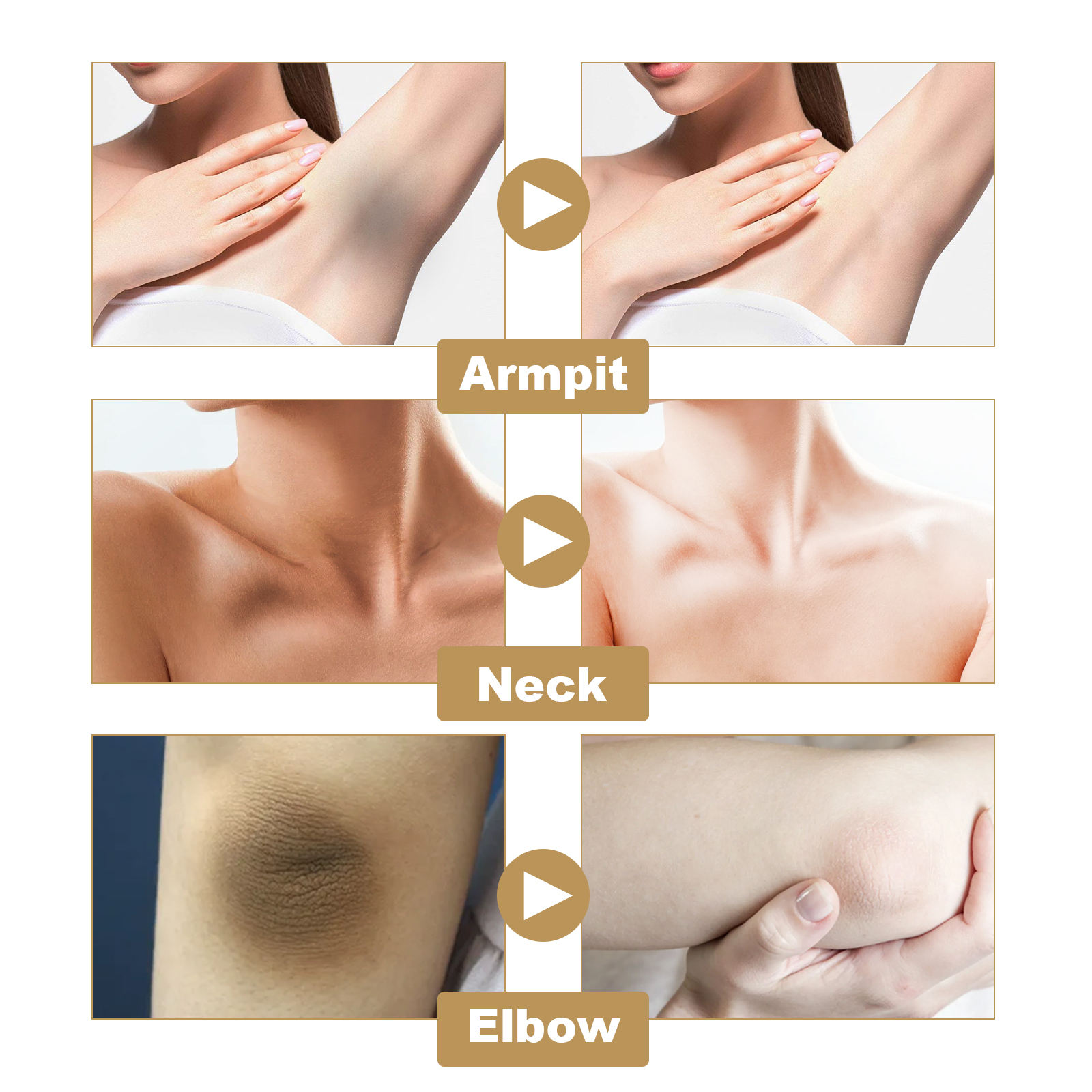 Our body whitening cream contains aloe vera, retinol, and niacinamide.It can brighten dull underarms, knees, neck, bikini line, areola, and nipples, whiten skin, strengthen the skin's moisturizing barrier, increase skin moisture content, prevent dryness, and brighten skin texture and tone.Its usage method is very simple: clean and dry the body skin, apply an appropriate amount of cream evenly on dull areas.Use your hands in circular motions and gently massage for absorption.Promote skin cell renewal for a fresher and more youthful complexion.